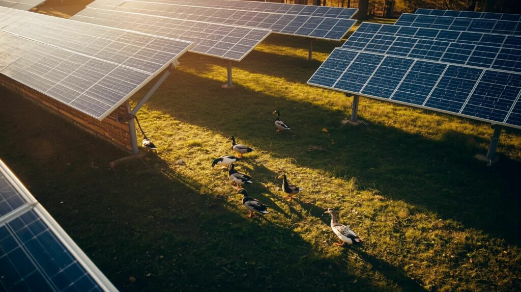 - Volailles et canards : Les ombrières solaires protègent les animaux du stress thermique, comme le montre un projet dans le Loiret où les canards se reposent sous les abris par 30 °C.